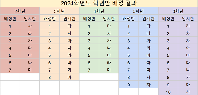 2024학년도 학년반 배정 결과 안내(2~6학년)